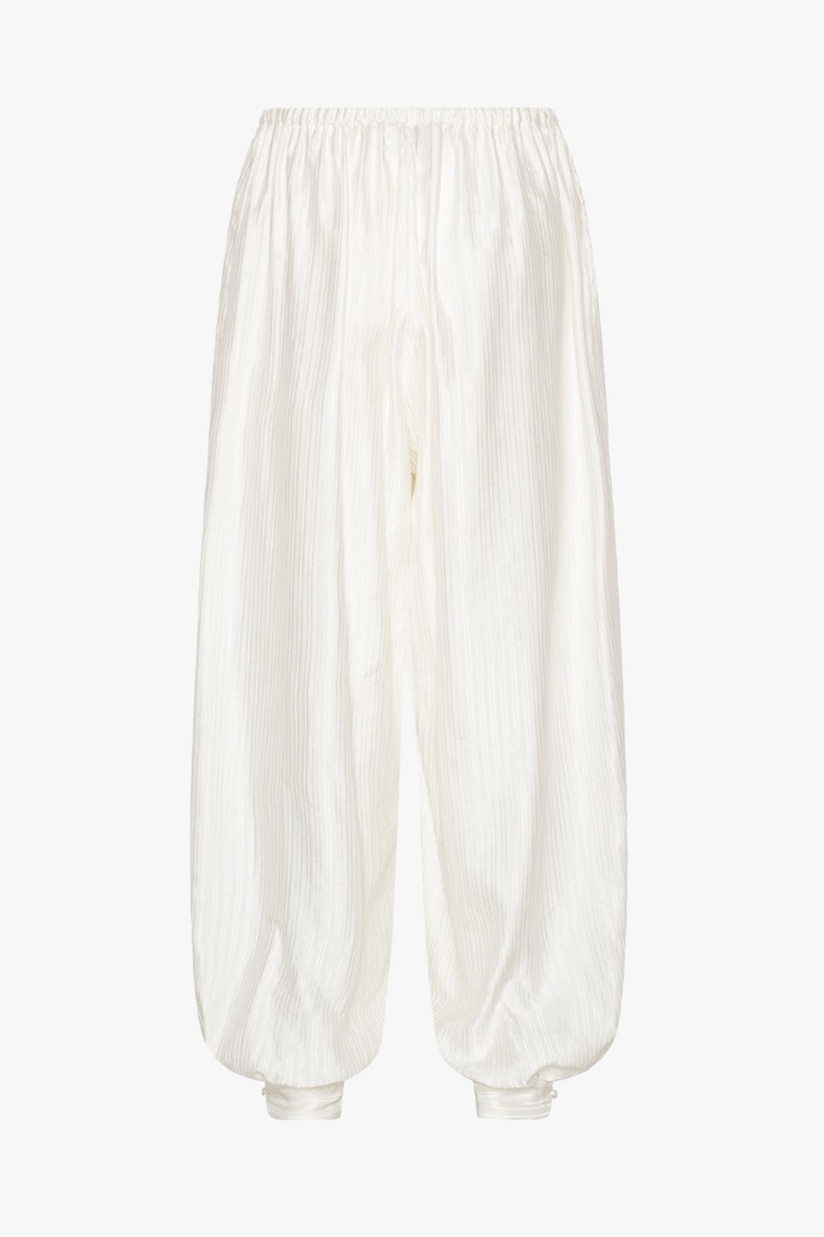 Striped Balloon Pants Bright White fra ROTATE Birger Christensen kombinerer volum og letthet i en moderne silhuett. Den myke viskosen gir et luftig fall, mens den subtile stripeteksturen tilfører dybde og en diskré glans. Den ballongformede fasongen med elastiske avslutninger skaper et lekent uttrykk som balanseres av en komfortabel midje med snøring.