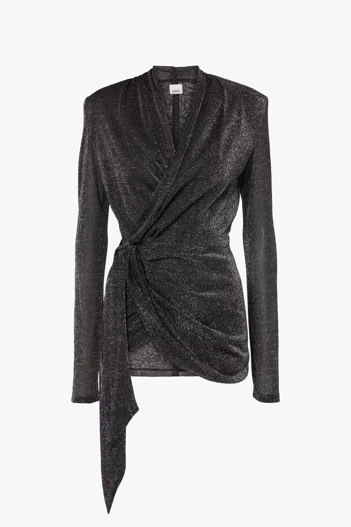 The Cinaye Top by Isabel Marant is a striking piece that perfectly blends glamour and sophistication. Designed in a shimmering black-silver fabric, this top features a wrap-effect silhouette with a flattering tie detail at the waist, accentuating your figure with ease. Ideal for evening events or festive occasions, pair the Cinaye Top with tailored trousers or a sleek skirt for an effortlessly chic ensemble.