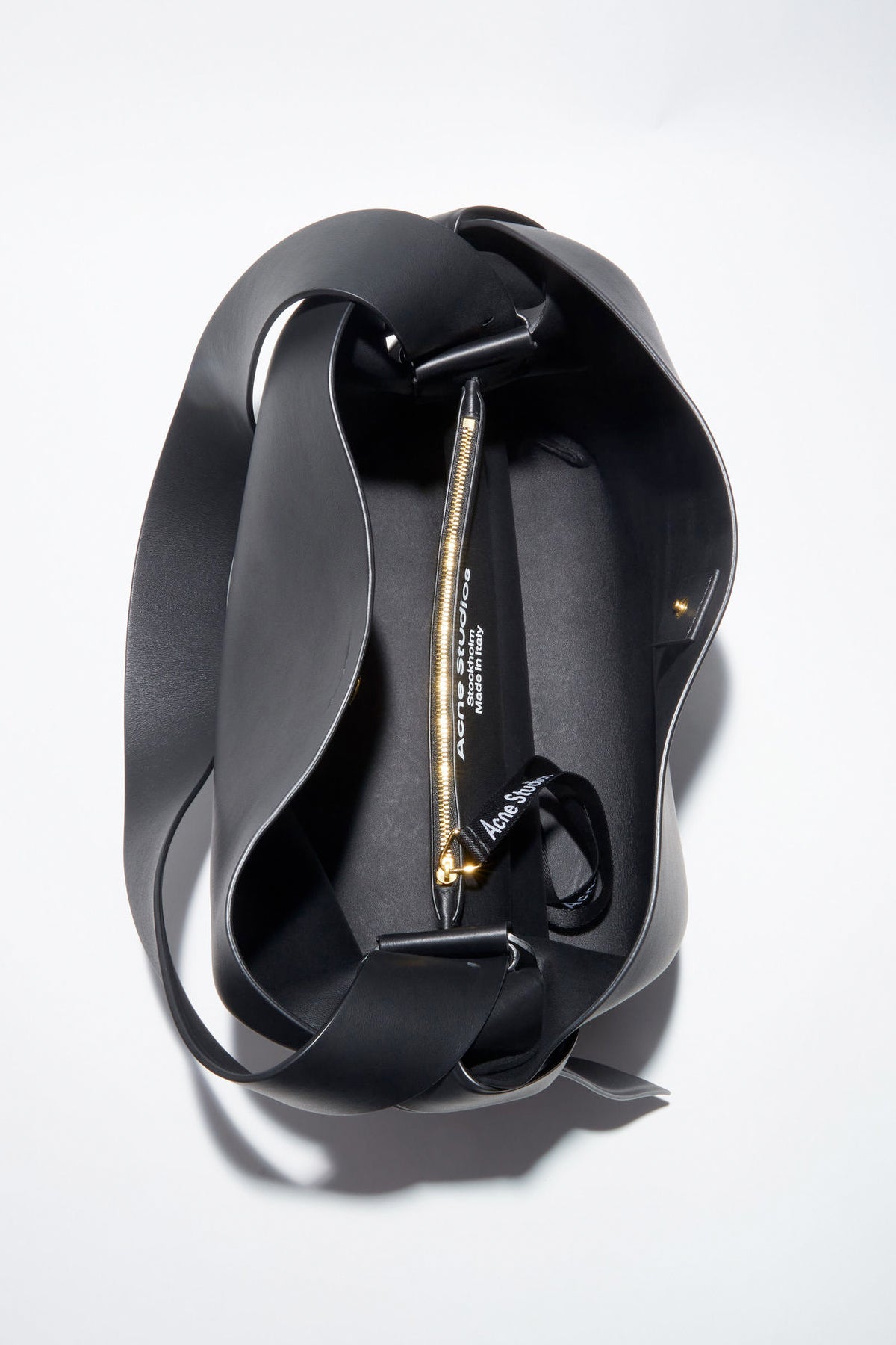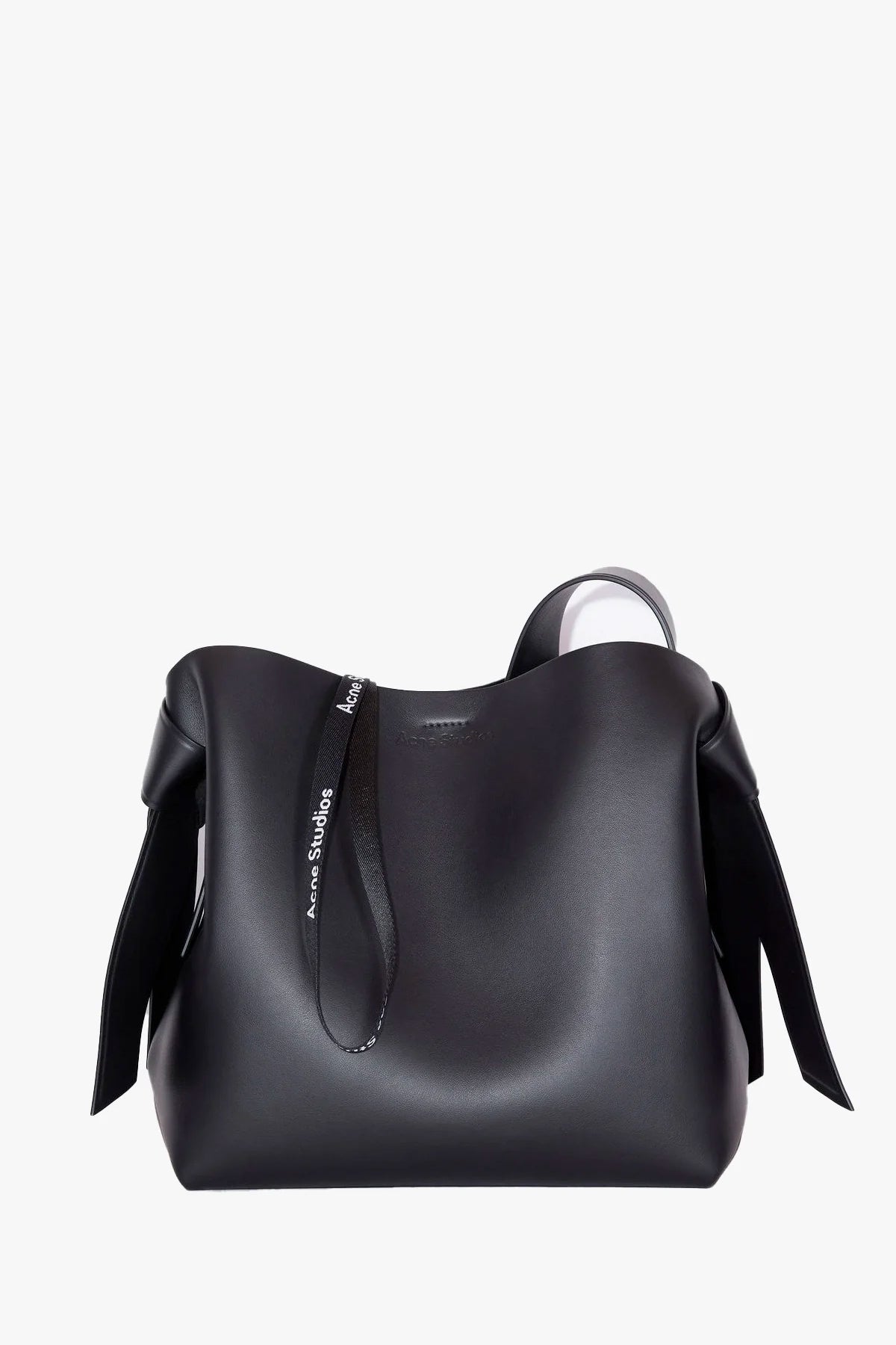Acne Studios black midi shoulder bag is made of soft leather and is adorned with twisted musubi knots on each side, inspired by traditional Japanese obi sashes. Completed with a middle zippered pocket compartment and a discrete magnetic closure.