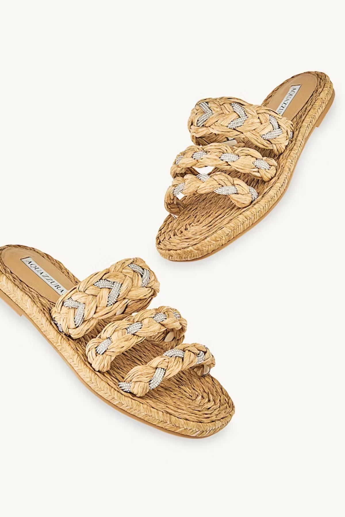 The Costiera Espadrilles showcase Aquazzuras appreciation for detail – look closely to spot the intricate crystal embellishments. Made from woven raffia, the understated open-toe silhouette features 15 mm flat soles reinforced with rubber for a comfortable stride.