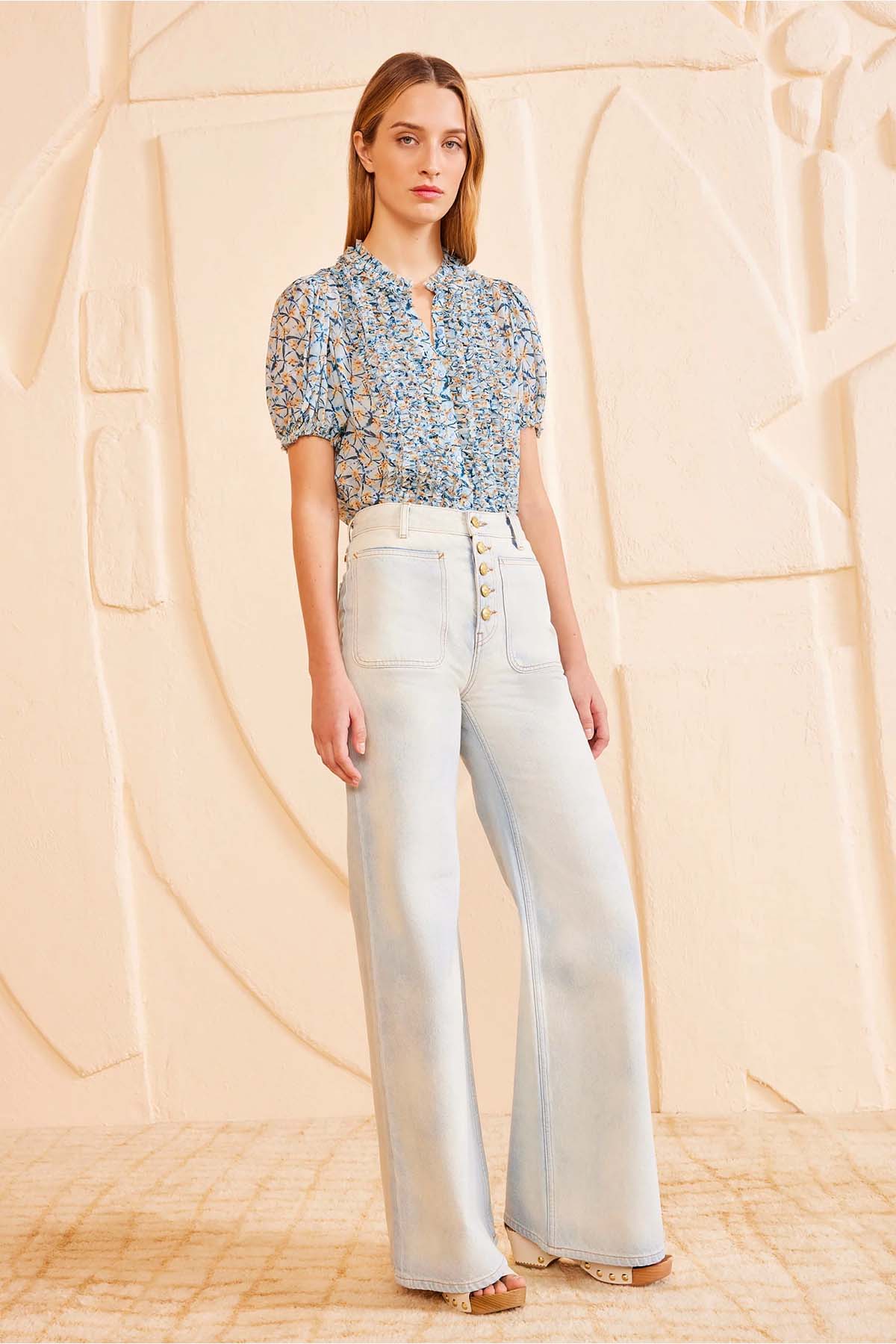 The Gwynne fuses elements from our beloved Lou Jean, re-envisioned into a fluid wide leg that elongates. This high-rise style is handmade in Los Angeles from rigid denim with a special, hand-rubbed marble dye technique that creates a unique, clouded effect. It frames the waist with oversized patch pockets and is adorned with exposed monogram-embossed buttons.