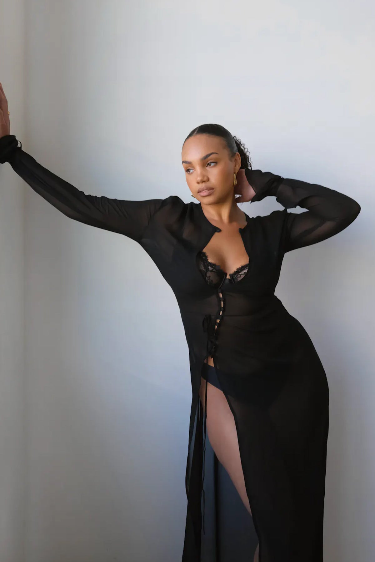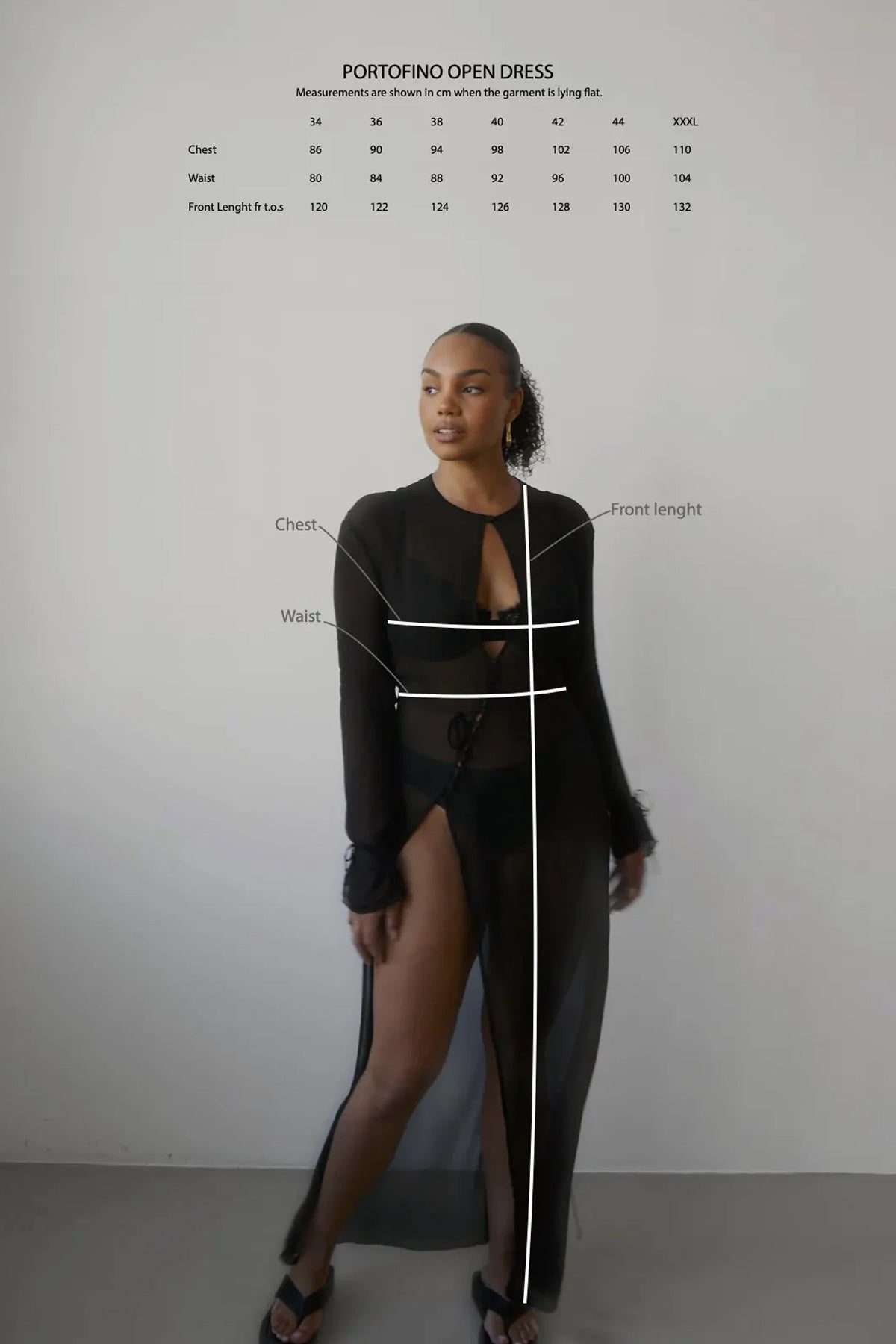 The Portofino Open Dress features a stunning design, complete with waist and sleeve straps that accentuate a beautiful silhouette. Adorned with covered buttons and delicate cutouts on the front, it exudes a distinctly feminine charm.