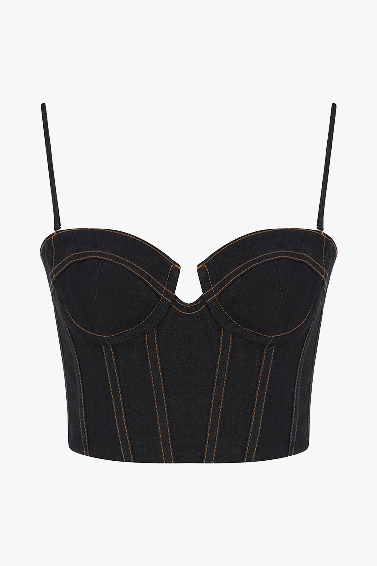 The Crush Denim Corset Top in Night Sky from the Resort 2025 Collection, Crush. A denim bodice featuring corset style waist, a shirred back with a zip closure and underwire with boning in the bust.