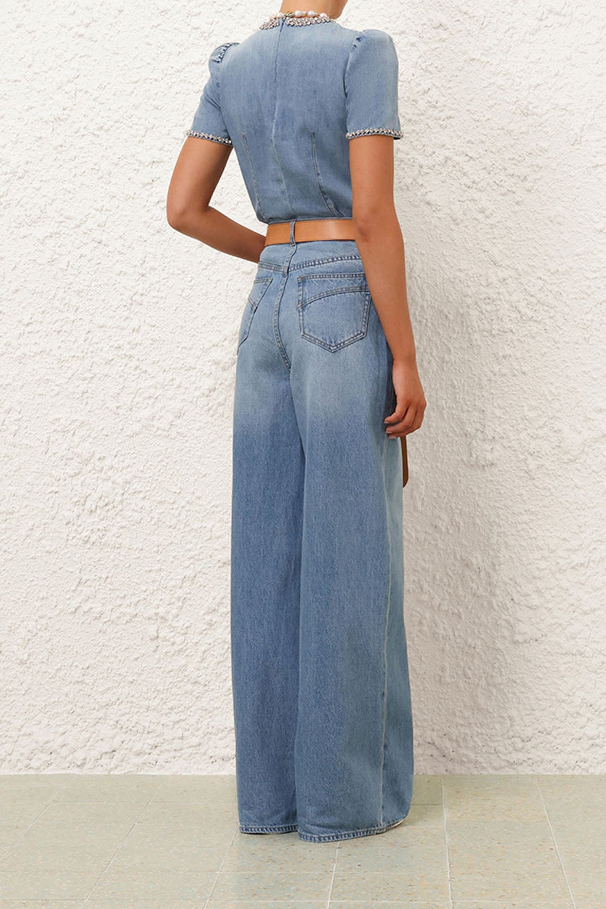 The Crush Straight Jean in Blue Moon from the Resort 2025 Collection, Crush. A high waisted denim jean featuring a straight, wide leg silhouette, a heart shaped front button and D-ring accessories at the front.