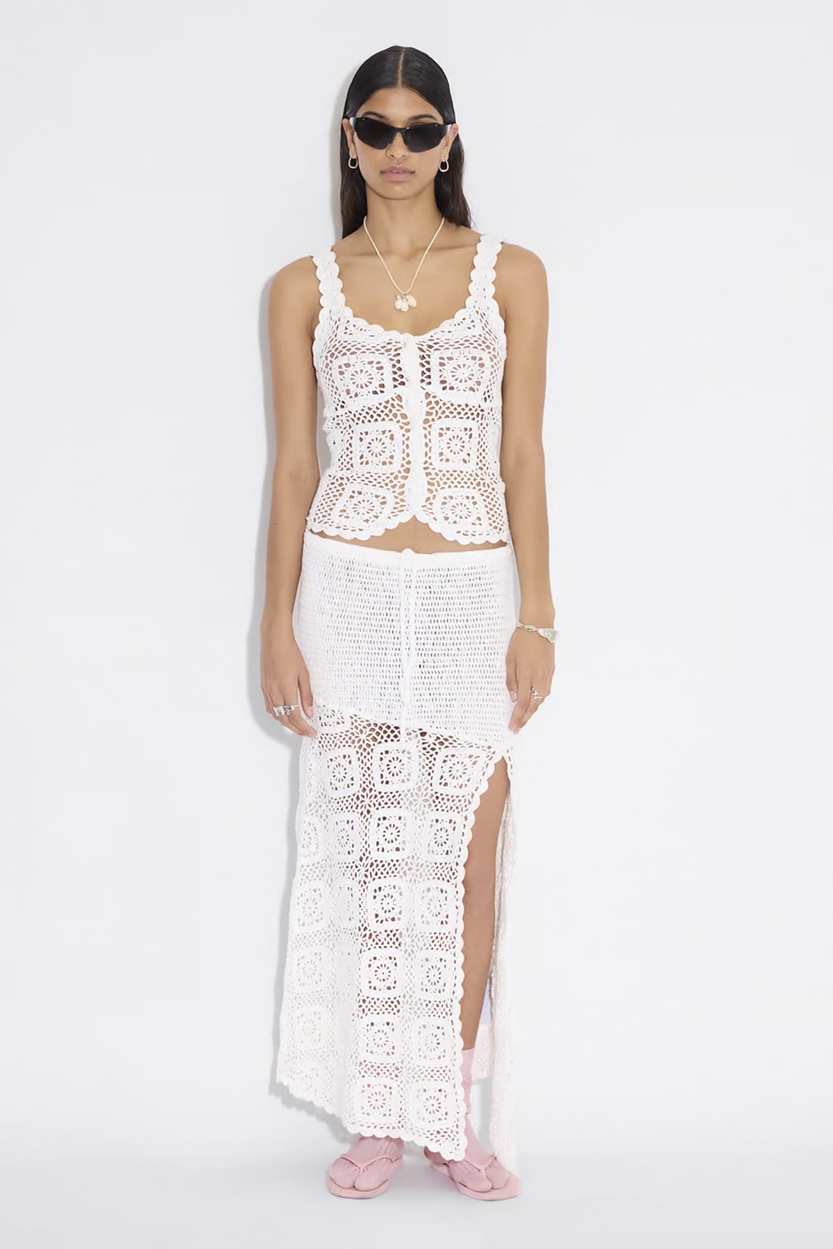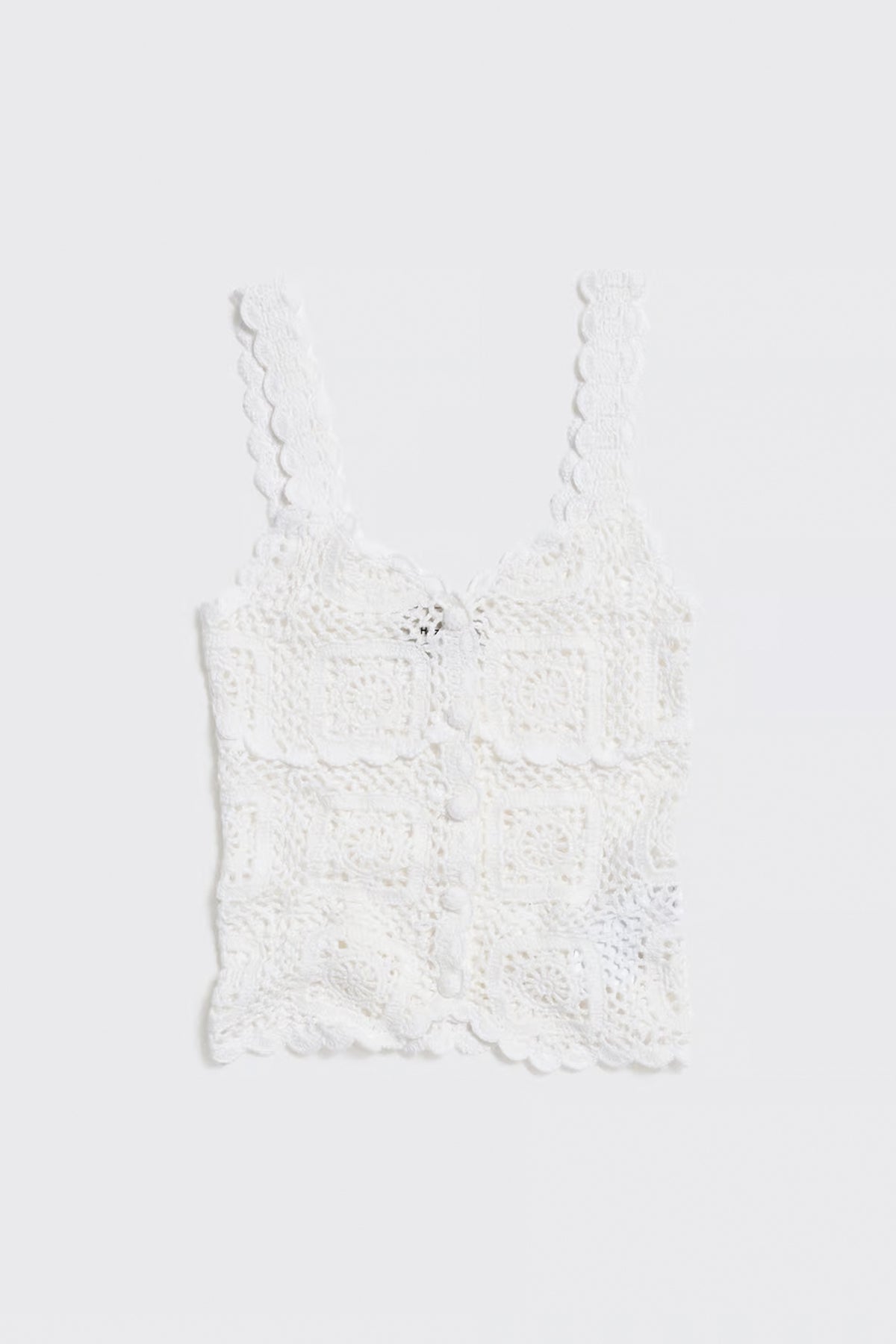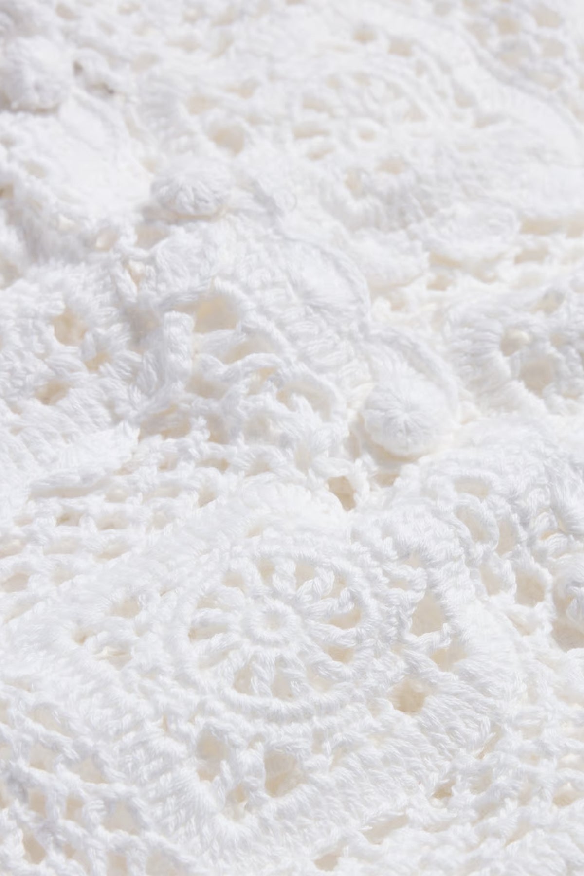 The Rosie Crochet top is made from organic cotton. It's detailed with intricate custom patterning, and it has concealed button fastenings, a tulip-shaped hem and scalloped edges. Style with the matching Rosie Crochet skirt. This is a handmade design, therefore a limited number is available.
