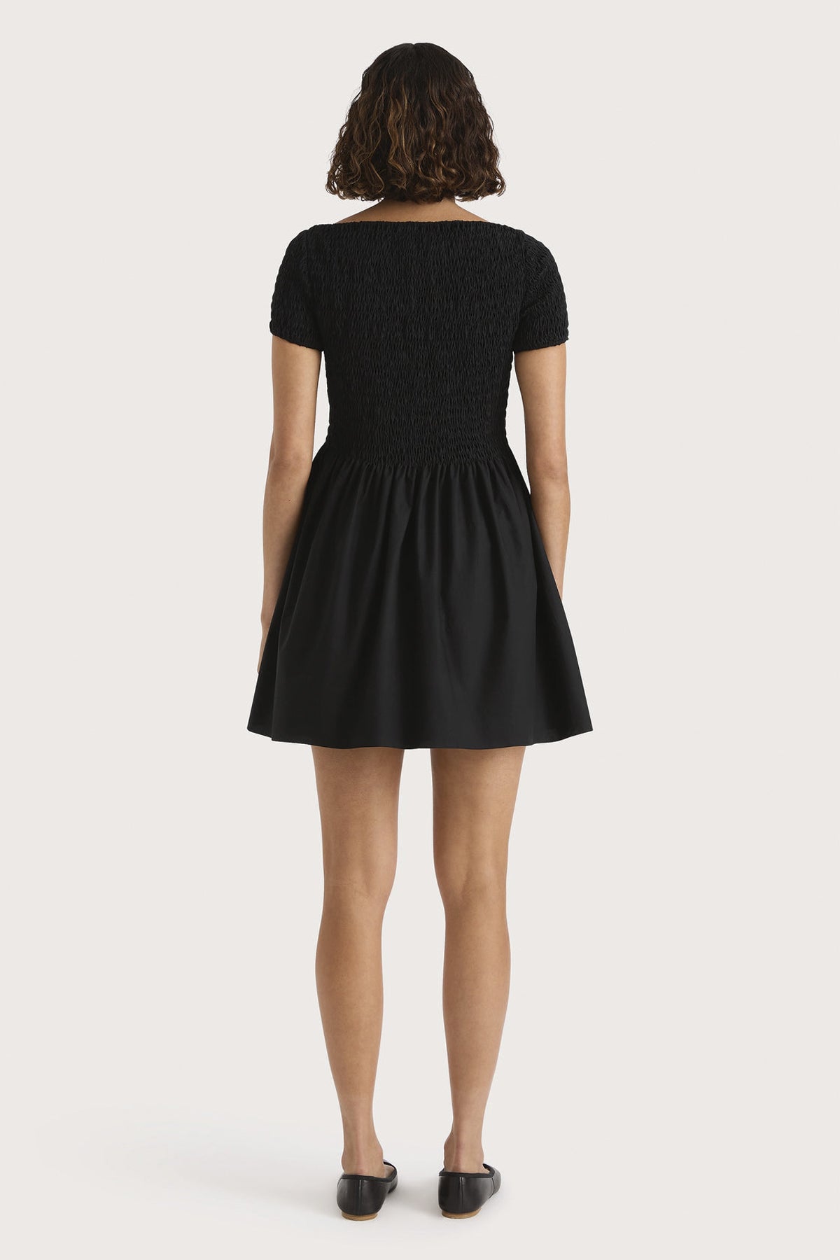 A feminine short sleeve mini dress with a shirred bodice and sleeves. It features a boat-style neckline and gathered waist with flared A-line skirt. Designed from 100% organic cotton in a classic black colourway, it is a sweet addition to your everyday wardrobe when paired with a simple sandal.