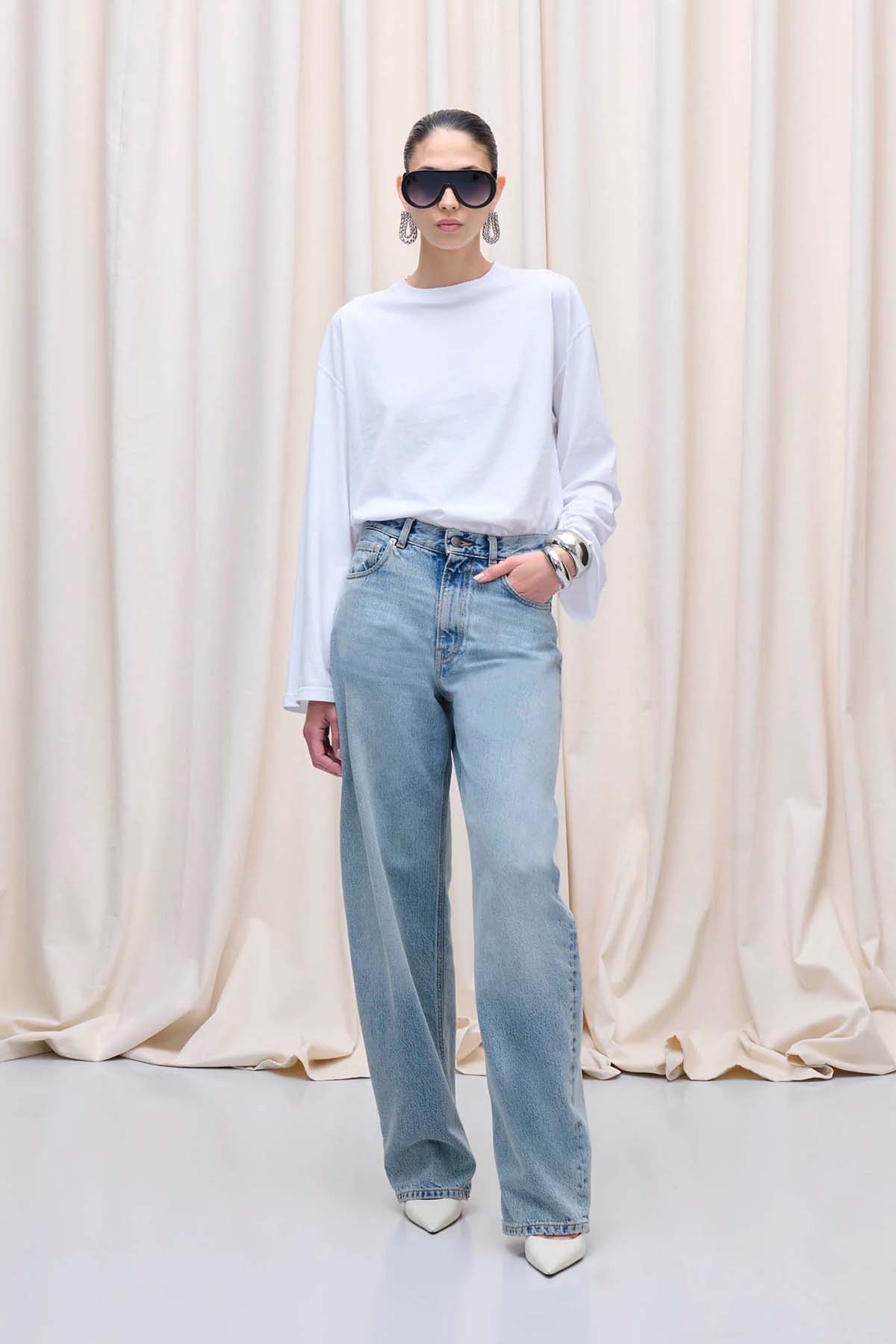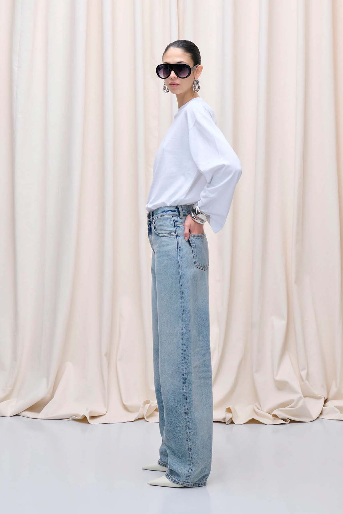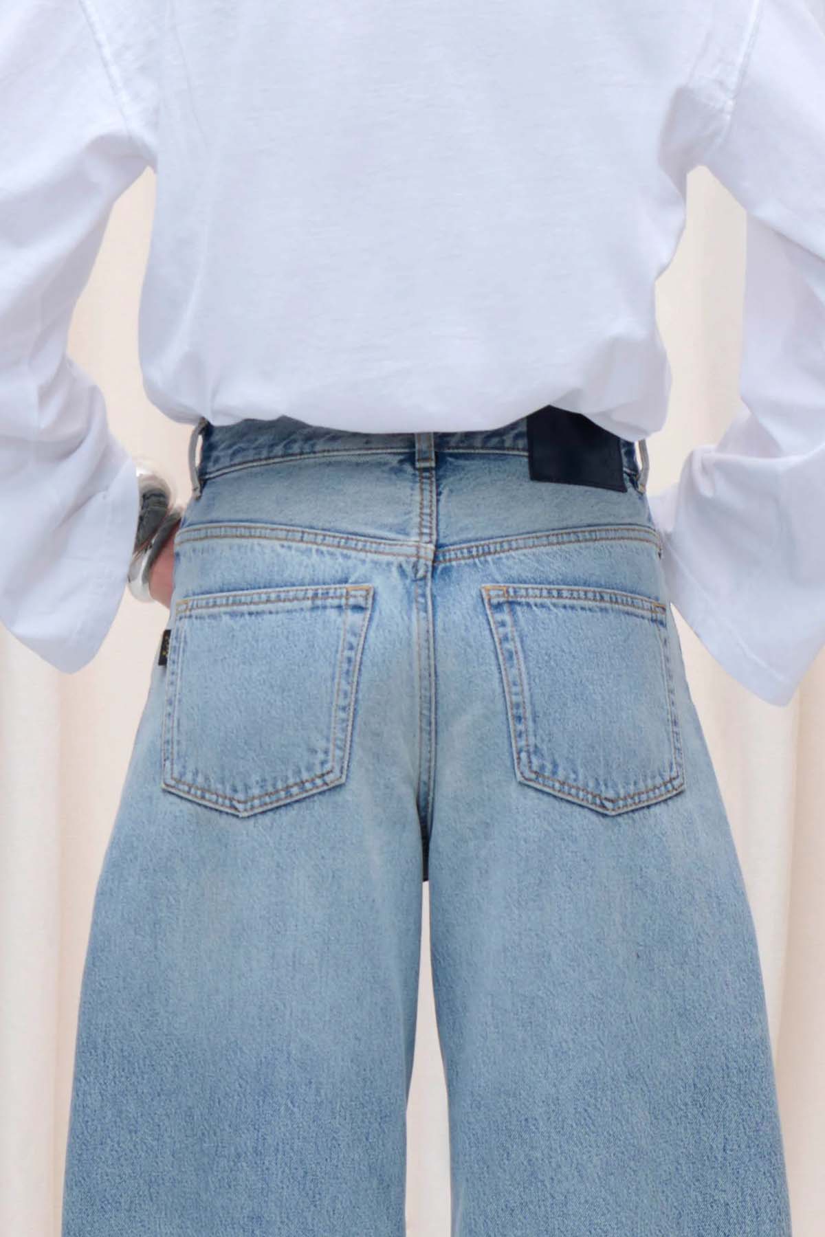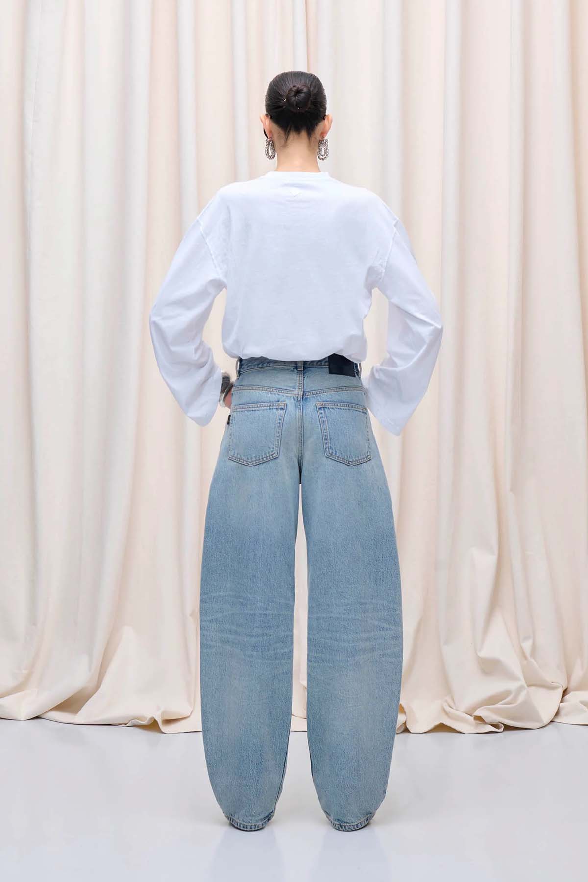 Denim trousers with a baloon silhoutte, offering a sculpted volume throught the leg and refined, tapered finish