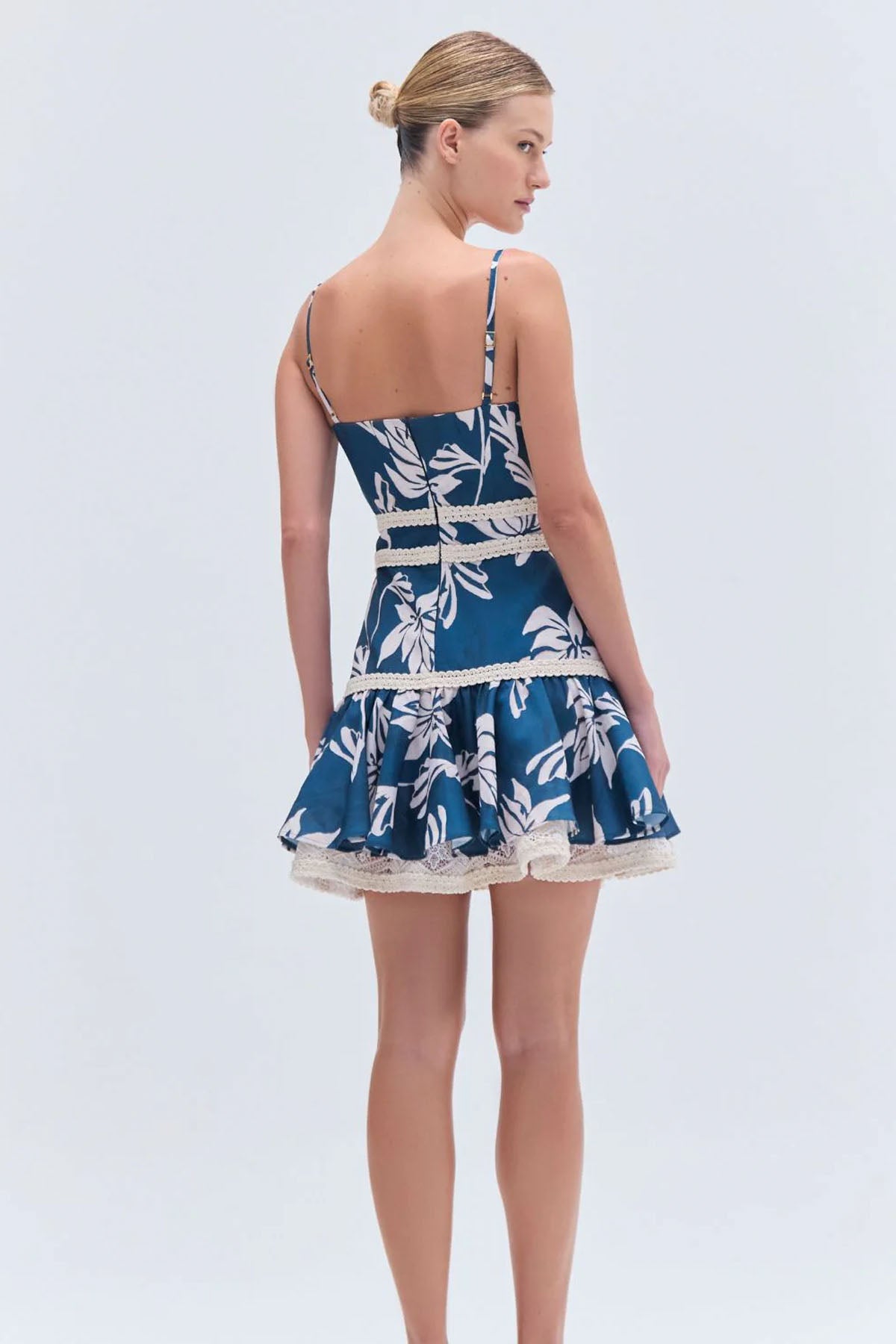 A vibrant summer statement, the Artichoke Mini Dress features an exclusive print with bustier-style structure and feminine crochet detailing. With beaded straps and a ruffled skirt, this silhouette brings a playful yet refined energy to warm-weather dressing.