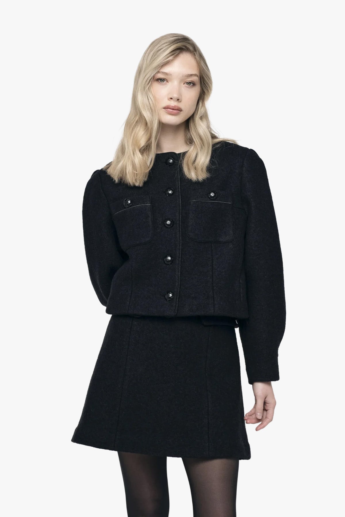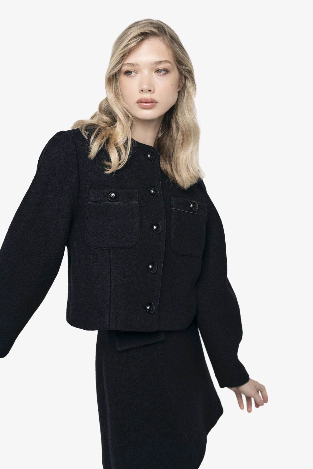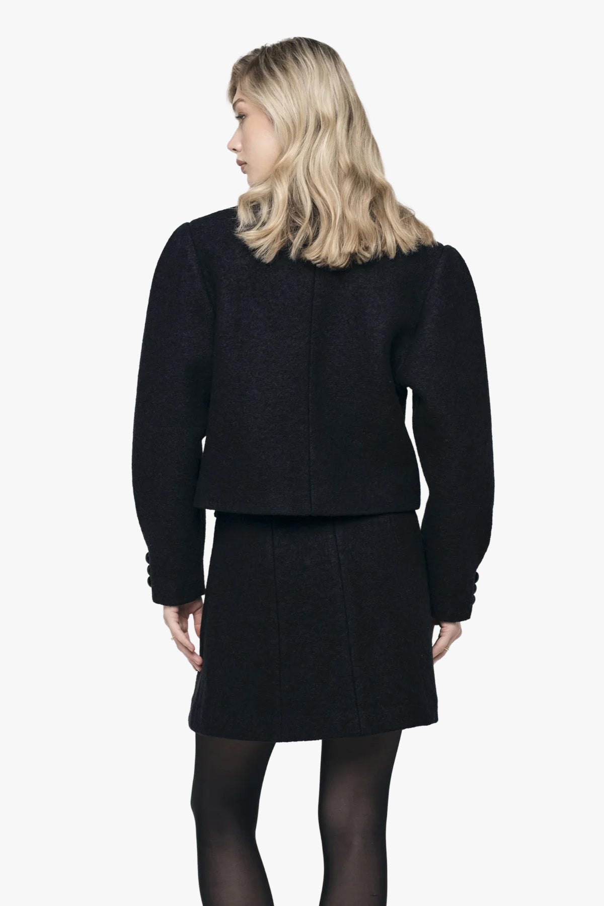 A short jacket in an exclusive wool-viscose bouclé that combines timeless elegance with modern tailoring. The jacket features a straight, boxy silhouette with rounded lines, long puffed sleeves, and a round neckline. It fastens with buttons at the front and pairs perfectly with the Madeleine Bouclé Skirt for a complete set.