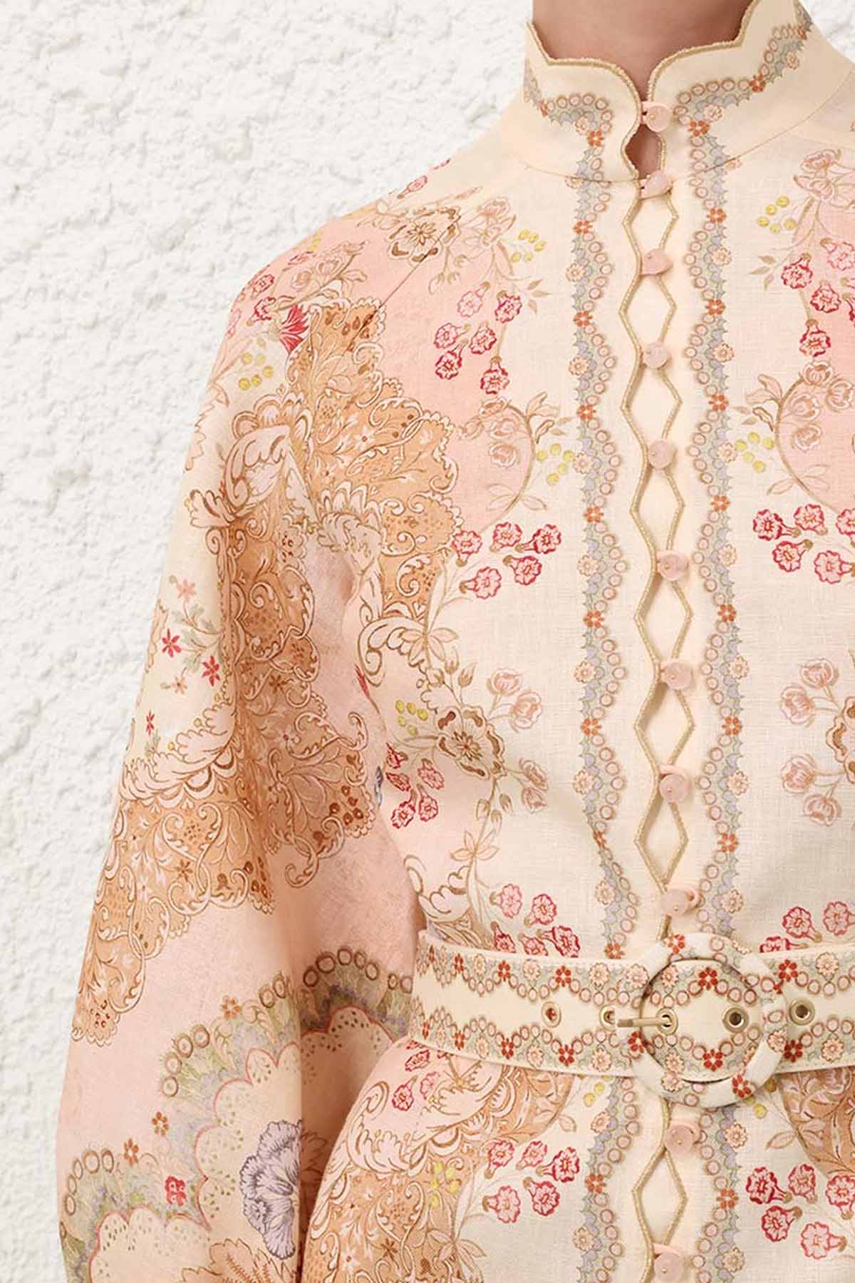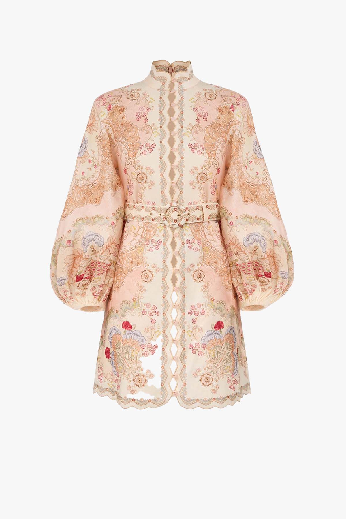 En elegant og luftig minikjole i lin fra Zimmermanns Resort Swim 2026-kolleksjon. Kjolen har ståkrage, rouleau-knapper foran og voluminøse ermer som gir bevegelse og letthet. Et avtagbart belte i midjen fremhever silhuetten, mens usynlig glidelås bak sikrer en polert finish.
