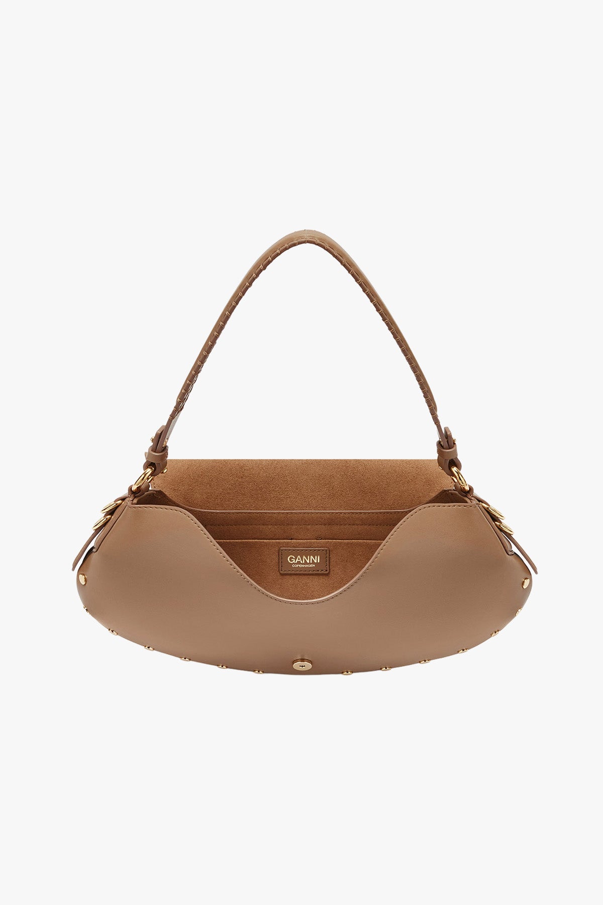 En elegant skulderveske med et mykt, avrundet design og dekorative studs som gir et sofistikert, men moderne uttrykk. Den strukturerte formen kombineres med gulldetaljer og en markert frontlukking som gjør vesken til et tydelig statement, samtidig som den er enkel å bruke til hverdags og kveld.