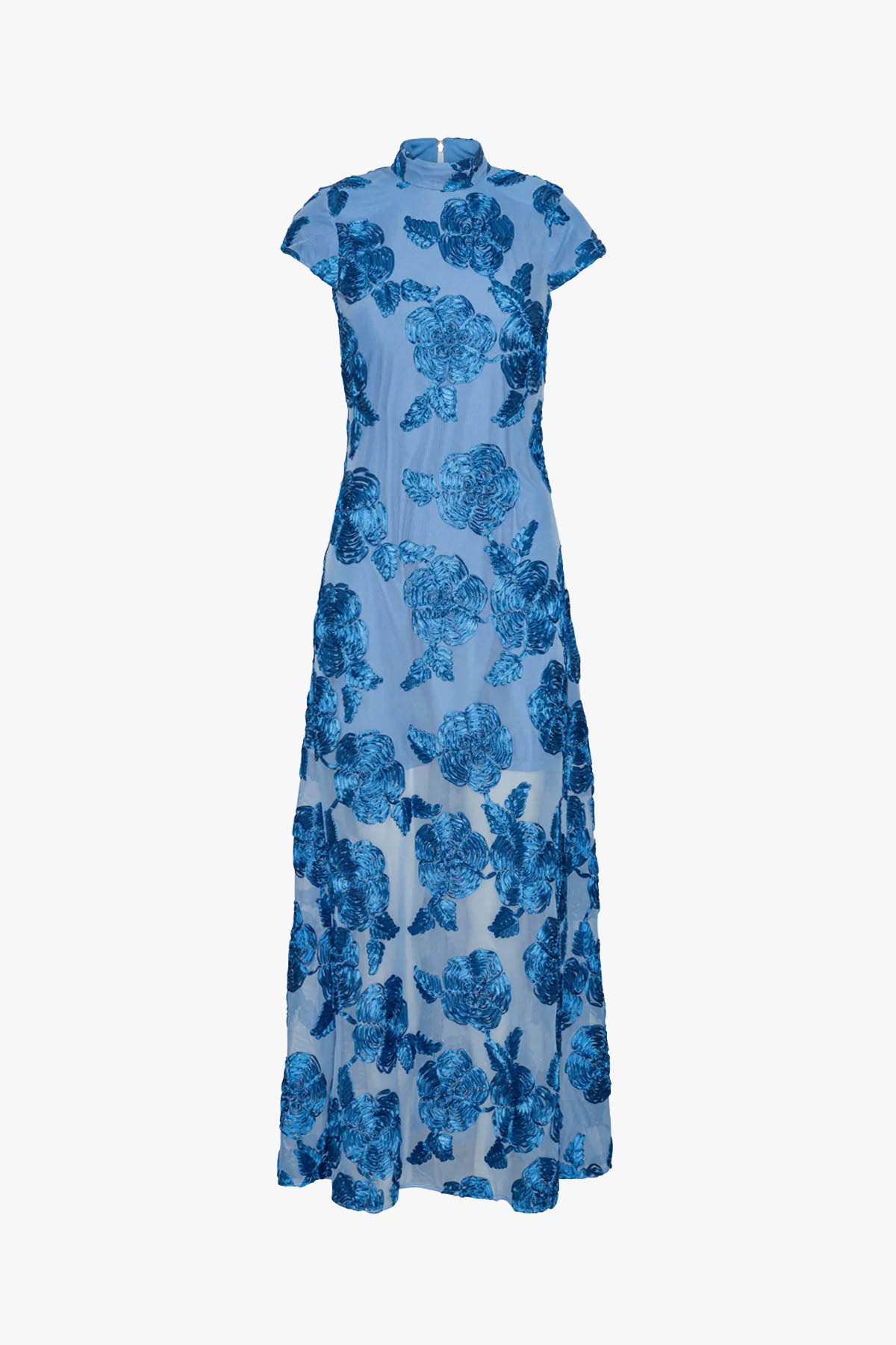En elegant og iøynefallende kjole fra Rotate, designet i lett og semitransparent mesh med markante blomsterdetaljer i glatt sateng som skaper et skulpturelt uttrykk. Den figurnære overdelen følger silhuetten før den faller mykt over i et flytende maxiskjørt, mens den høye halsen og de korte ermene gir en moderne og balansert finish. En diskré, skjult glidelås bak sikrer et rent og sofistikert uttrykk.