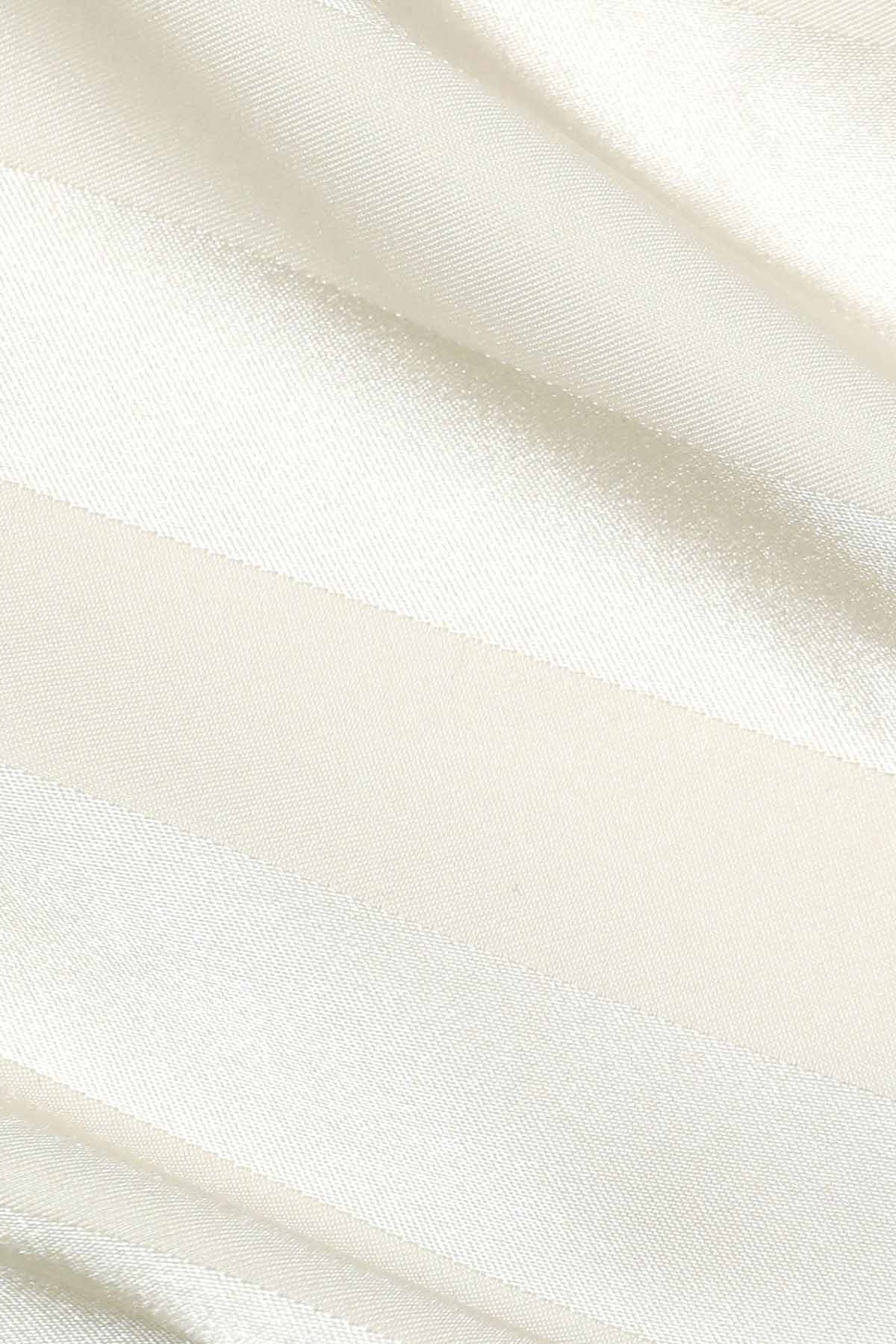 Bias-cut maxi-kjole i gult satengstripet jacquard med moderne, grafisk uttrykk. Ton-i-ton 3D-blomsterapplikasjoner gir ekstra romantikk. Perfekt til bryllup eller formelle anledninger – bruk med høye hæler for full effekt.