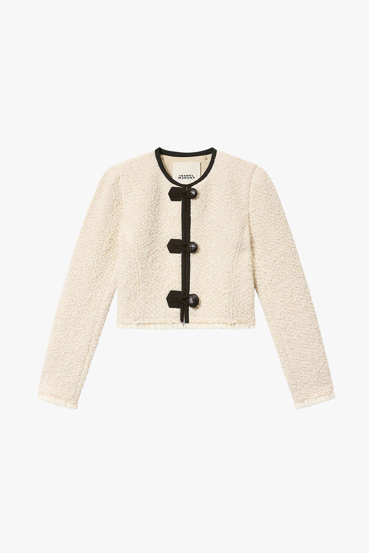 Eelegant bouclé-jakke med strukturerte skuldre og rund hals. Jakken skiller seg ut med kontrasterende kanter, frynsefinish og stilfulle detaljer i imitert semsket skinn og skinnknapper.