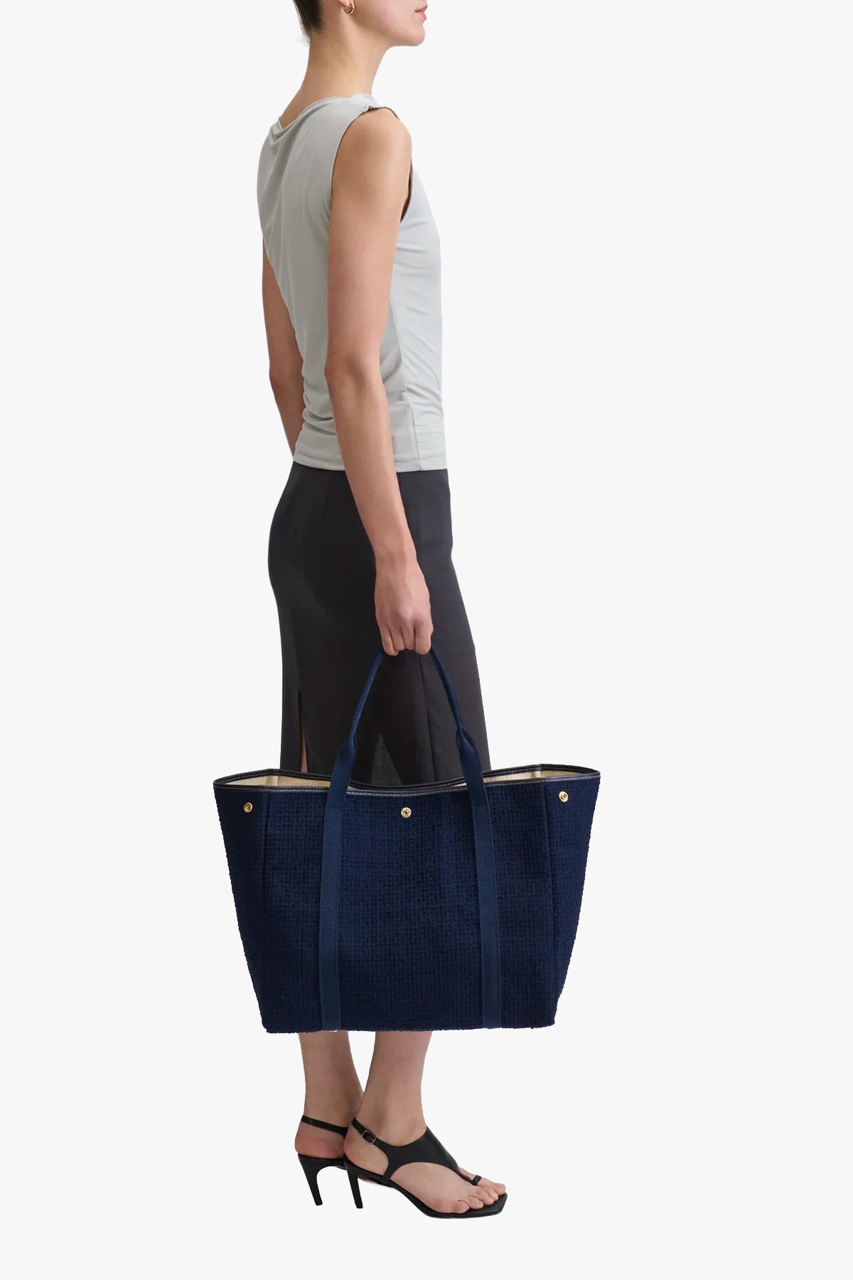 Traversée L Tweed Nuit fra Rue de Verneuil er en romslig tote med en strukturert silhuett og et teksturert tweed-uttrykk. Den dype fargetonen gir vesken et sofistikert preg, mens materialkombinasjonen tilfører både karakter og slitestyrke. En funksjonell modell som passer like godt til hverdags som til reise.