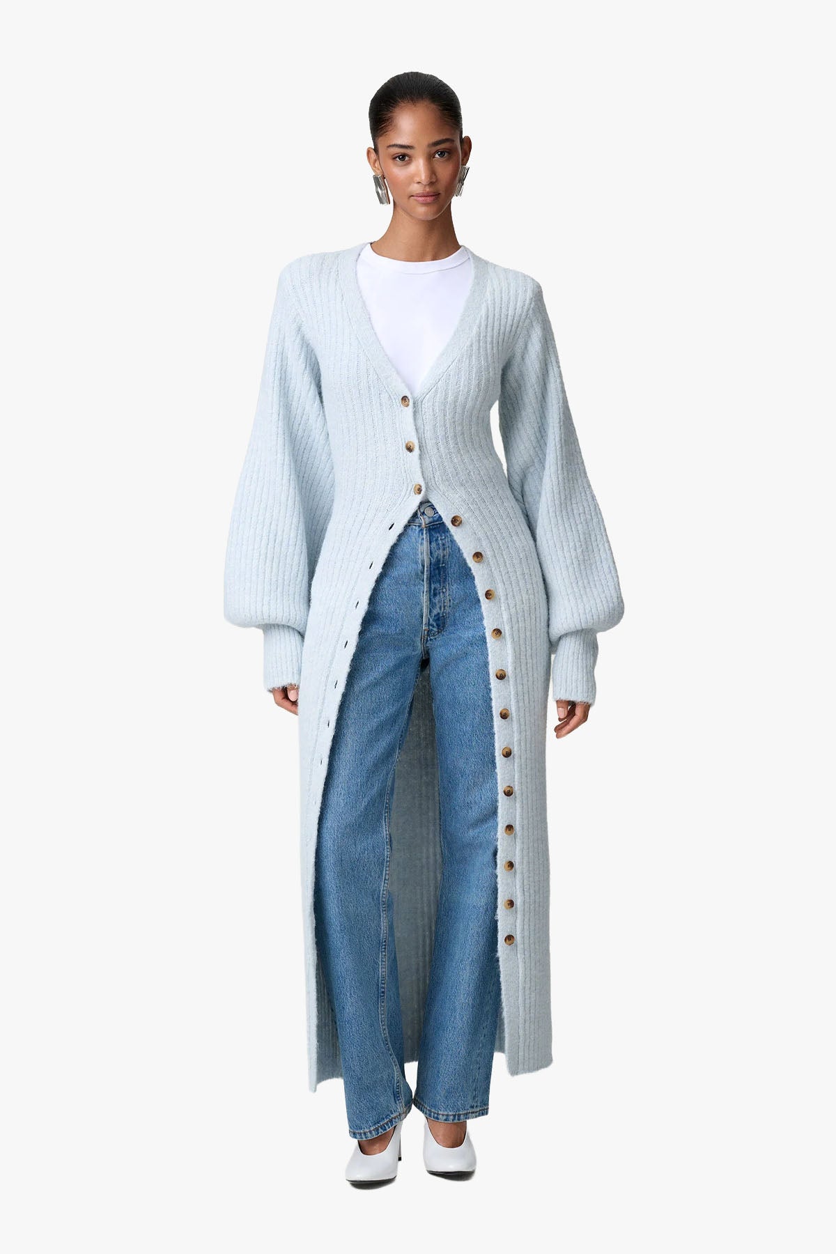 Montana Maxi Dress er en feminin maxikjole med timeglassform, strikket i et mykt og behagelig materiale. Den lyseblå melerte tonen gir et rolig og sofistikert uttrykk, mens knappelukking og V-hals tilfører et klassisk preg. En gjennomført kjole som fungerer like godt til hverdags som til mer pyntede anledninger.