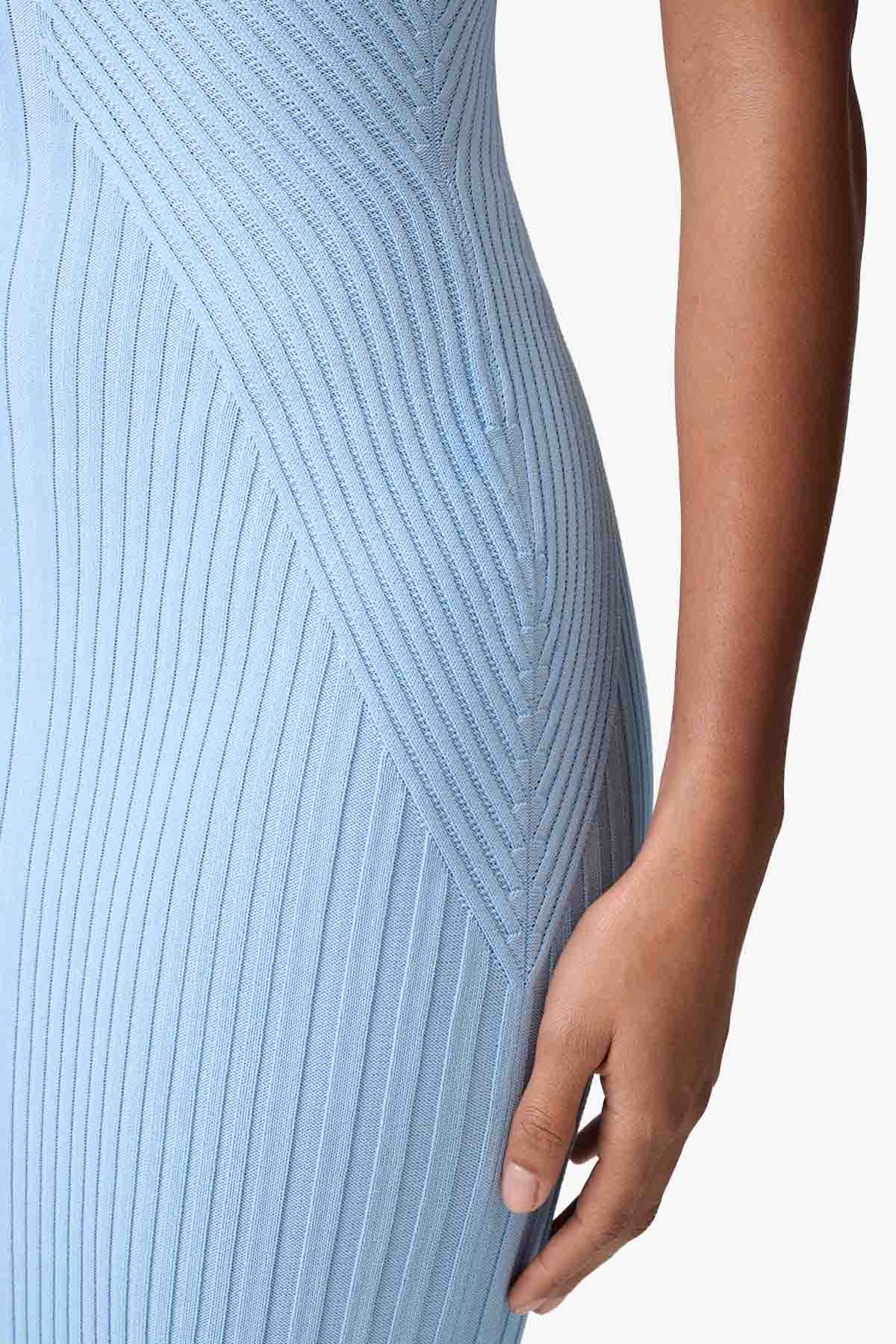 Lugo Dress er en elegant maxikjole i en lys blå tone, designet med markert midje og et figurnært mermaid-skjørt som fremhever silhuetten. Det stretchy, strikkede materialet gir både komfort og et sofistikert uttrykk. En gjennomført kjole som passer like godt til formelle anledninger som til mer pyntede hverdagsantrekk.