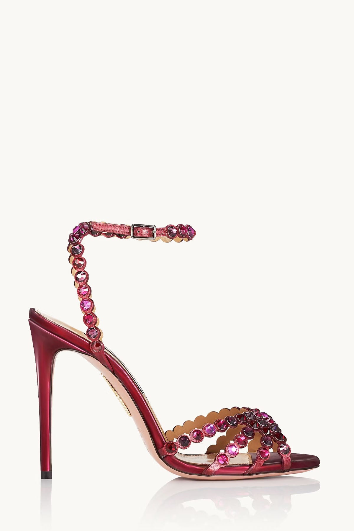 Elegant and glamorous, with a hint of playfulness – our Tequila Sandals are a fabulous option for your next event. This 'Ruby' pair is crafted from luminous satin and metallic leather, scattered with tonal crystals for a jewel-like shine. The slim straps keep your foot securely in place, while the 105 mm stiletto heels guarantee all eyes are on you.